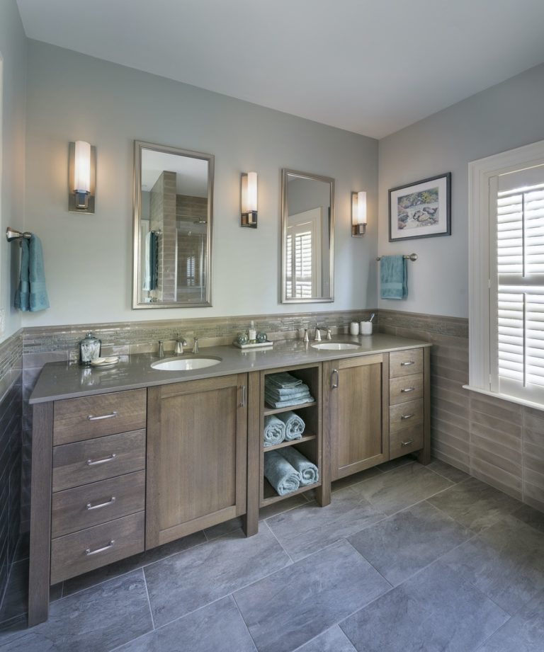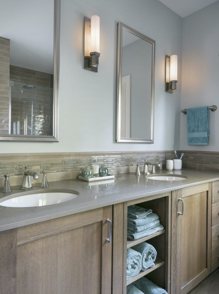 After 17 years of living in their home, our clients wanted to create a master bedroom suite that included a master bathroom and a master closet that would allow for privacy, maximum storage, and natural light. Feinmann designed an exquisite master bedroom suite by using the spare bedroom and closets. The spare bedroom was converted into a master bathroom. Features of the bathroom include a dual vanity made of White Oak in a Barnwood Finish to create a warm appeal with modern style, while the counters bring an earthy brown shade consisting of Ginger Quartz Caesarstone that blend seamlessly to ... read moreLet There Be Light