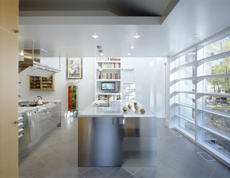 The owners of a 1950s split level ranch in Newton wanted to enlarge their kitchen, living and dining area on the main floor with views of the back yard. A 968 square foot two-level addition provides an open floor plan with a new kitchen and combination living-dining room that features a zero clearance, wood-burning fireplace, and built-in shelves. On the lower level, what was formerly the husband’s office will now be a guest room. A new full bath, laundry room, and playroom that exits to the back yard were all part of the project. An existing screened-in porch was incorporated ... read moreKitchen As Sculpture