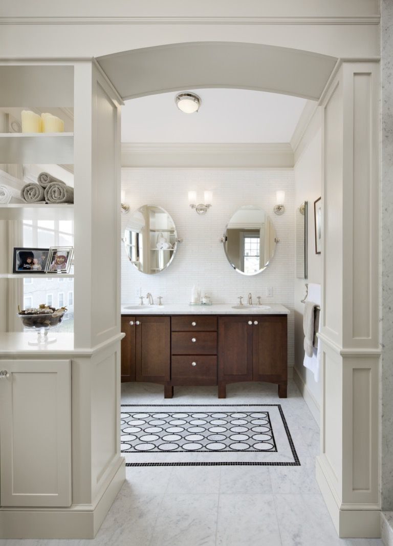 The owners of a Mid-Century modern home in Newton Corner contacted Feinmann after attending one of our remodeling workshops. They had several projects in mind to refresh and update their house including renovating the master bath and two additional baths, reworking the layout of the family room within the same footprint, and updating elements of the foyer and living room. A modicum of changes produced impressive results in the living room, family room and bathrooms. The brick fireplace and hearth were clad in Bianca Carrera marble tiles providing a sleek makeover that enhanced the space. Another element that adds interest ... read moreMaster Bath Awash in Circles