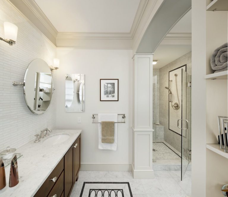 The Feinmann design team was asked to create a modern, spacious master bathroom on the second floor of a 19th century Colonial home in the historic district of Arlington. The homeowner, the only fulltime occupant of the house, requested a scheme with a masculine aesthetic, additional storage, a high-end steam shower, and secondary laundry area. In order to create the large master bathroom he desired, the floor plan of the second story needed to be reconfigured significantly. A small bedroom area, hallway, and small bathroom became the new master bedroom area, while an adjacent small bedroom and small bathroom were ... read moreElegant Bathroom