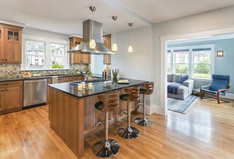 Feinmann remodeled the kitchen and master bathroom in this classic brick townhouse in Brookline, MA. The homeowner’s goals were to modernize their kitchen while retaining their stunning, more traditional stacked molding. The Kitchen The kitchen has a contemporary feel, an abundance of natural light, and clean lines. It features custom maple cabinets painted white built by North American Cabinets. Their cabinet system includes a glass display around the perimeter near the ceiling. This design element draws the eyes towards the stacked molding that seamlessly integrates with the space. In the middle of the kitchen, there is an island that seats ... read moreElevated Living