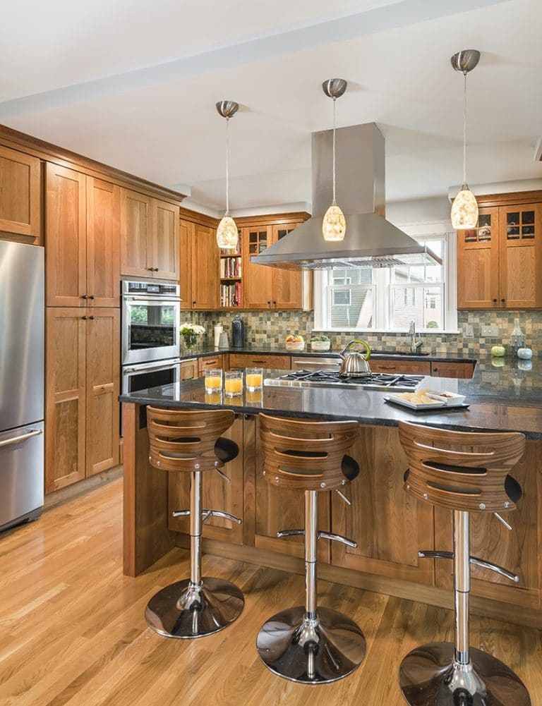The owners of an 1880s Victorian in Arlington returned to Feinmann to reconfigure their first floor, connecting the old, small kitchen with the existing dining room. They asked for a large island with seating and a walk-in pantry as part of the renovation. The wall between the kitchen and dining room was removed to create a more open floor plan. Feinmann had previously created a new, award-winning master bathroom and family bathroom for this client. As their family continued to grow, they began planning their next big project. Additional requests included providing access to the backyard and refinishing the back ... read moreChef’s Kitchen