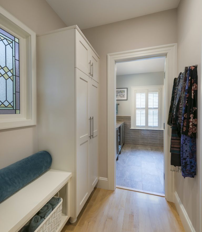The Feinmann design team was asked to create a modern, spacious master bathroom on the second floor of a 19th century Colonial home in the historic district of Arlington. The homeowner, the only fulltime occupant of the house, requested a scheme with a masculine aesthetic, additional storage, a high-end steam shower, and secondary laundry area. In order to create the large master bathroom he desired, the floor plan of the second story needed to be reconfigured significantly. A small bedroom area, hallway, and small bathroom became the new master bedroom area, while an adjacent small bedroom and small bathroom were ... read moreOpen and Airy