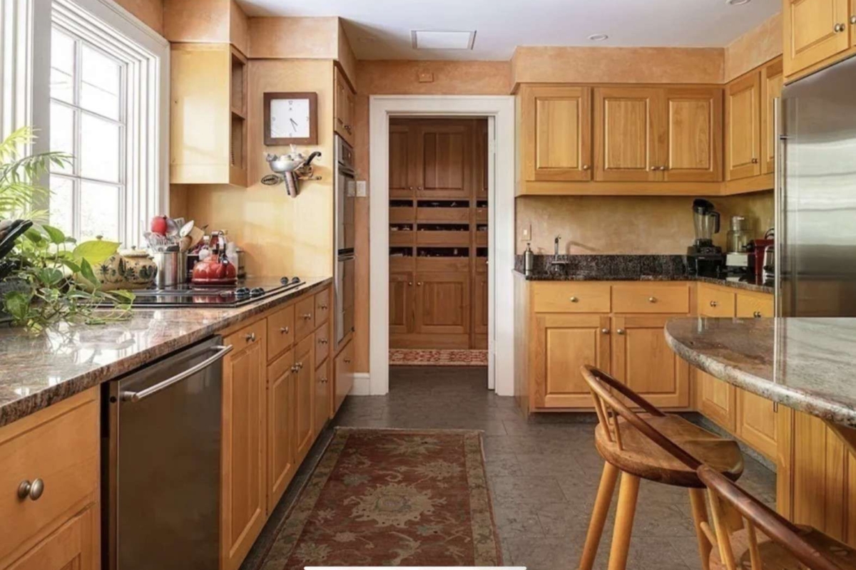 A Victorian home’s first floor has been beautifully reconfigured to combine a small kitchen with the dining room, creating a spacious and cohesive area. The Arlington, MA, remodel features a large island with ample seating and a walk-in pantry, enhancing the home’s functionality. By removing the wall that once separated the kitchen from the dining room, Feinmanan created an open floor plan that now invites natural light and sociable cooking experiences. The new walk-in pantry, neatly tucked between the kitchen and the front entrance, adds convenience and storage to this harmonious blend of tradition and modernity.