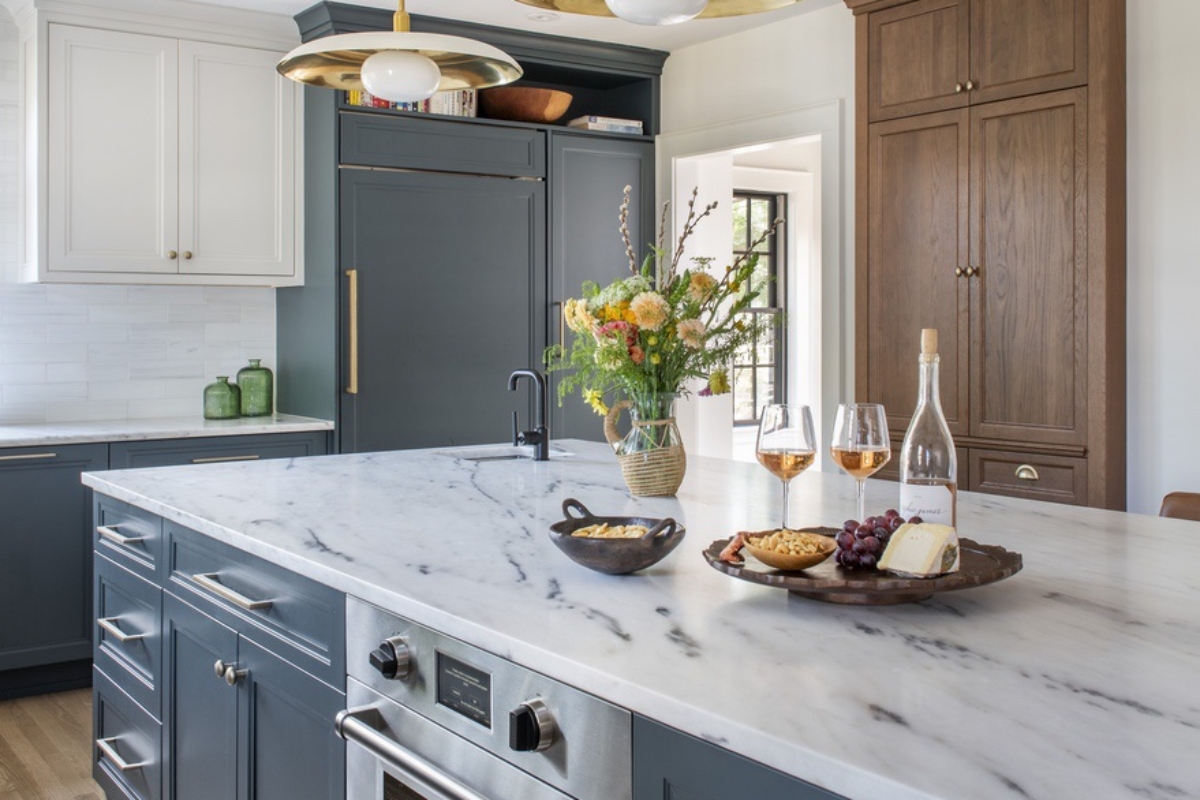 This Feinmann kitchen refresh caters to the needs of a multi-generational family. The Newton, MA, transformation prioritizes versatile cooking, prep, and serving areas. A custom appliance garage with a touch-button sandstone door blends functionality and design, concealing appliances for a tidy look. This feature allows easy access while satisfying the desire for uncluttered counters, harmonizing the family’s varying preferences within a modern, efficient space.