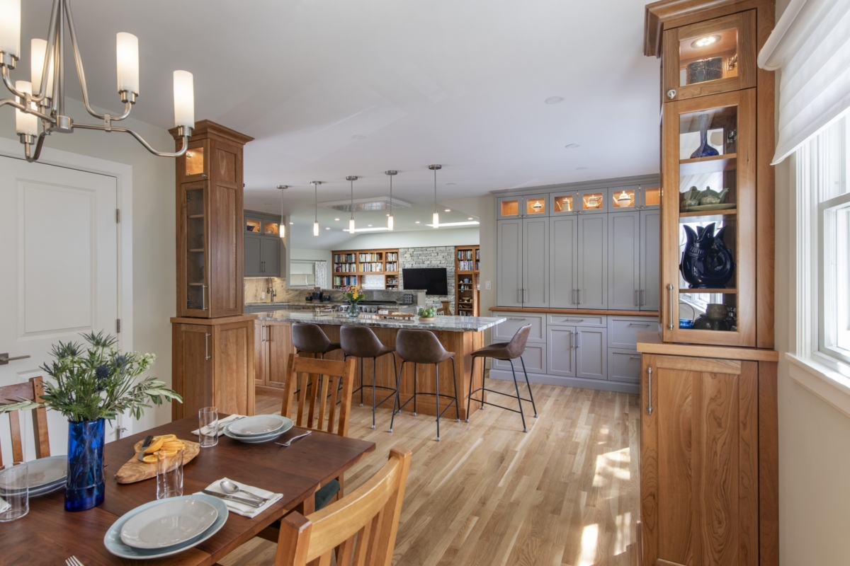 The owners of this Sudbury, Massachusetts, home came to Feinmann seeking to enlarge and update their kitchen. They requested an area for family dinners and gatherings and additional counter space for cooking and baking. To meet the client’s needs, Feinmann opened the room from its dark, “boxy” confines by taking down the wall between the dining room and kitchen.