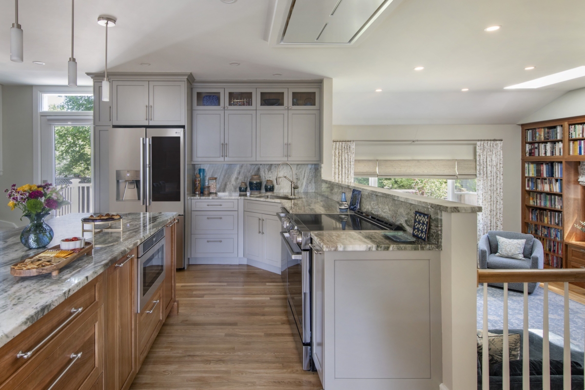 The owners of this Queen Anne Victorian in Belmont, Massachusetts, envisioned a new kitchen that was more extensive and functional than their existing one. With their backyard area having a classic barn, we designed their renovation to take advantage of their lovely views. We also expanded the kitchen’s footprint, created a new hallway bordered with three sets of sliding glass doors, and opened the kitchen to the family room to release the space from its previous “confinement.