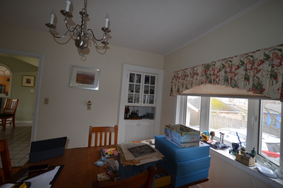Feinmann worked their magic to transform this 1920s dark and outdated kitchen. By skillfully removing the dividing wall, repositioning the half bath, and adding new double-hung windows, this bungalow now boasts a fresh and open ambiance. The upper cabinets in bright white beautifully contrast with the cherry lower cabinet drawers. Pendant lighting gracefully hangs over the island, and a pendant chandelier takes center stage in the inviting eating area.